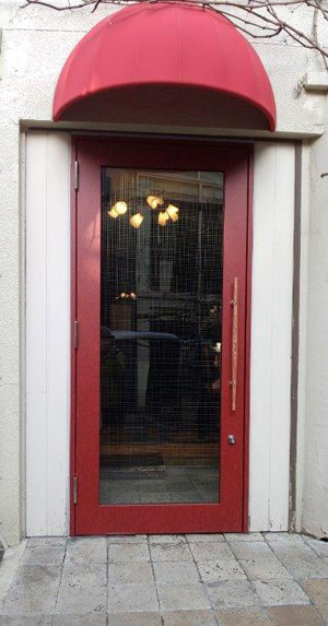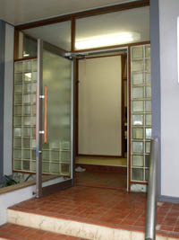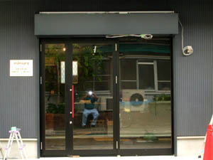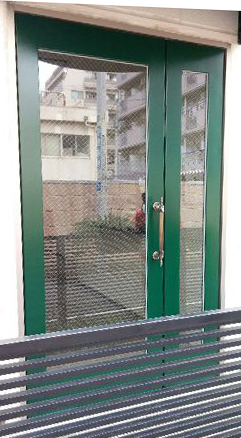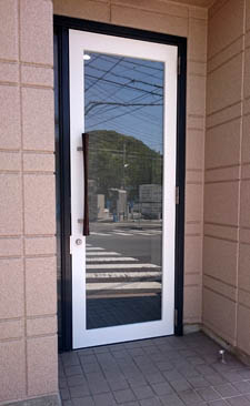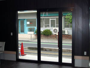 中央が2枚引き違いサッシで、両サイドの4枚がFIXの店舗入り口を、開き戸タイプのドアに替えて